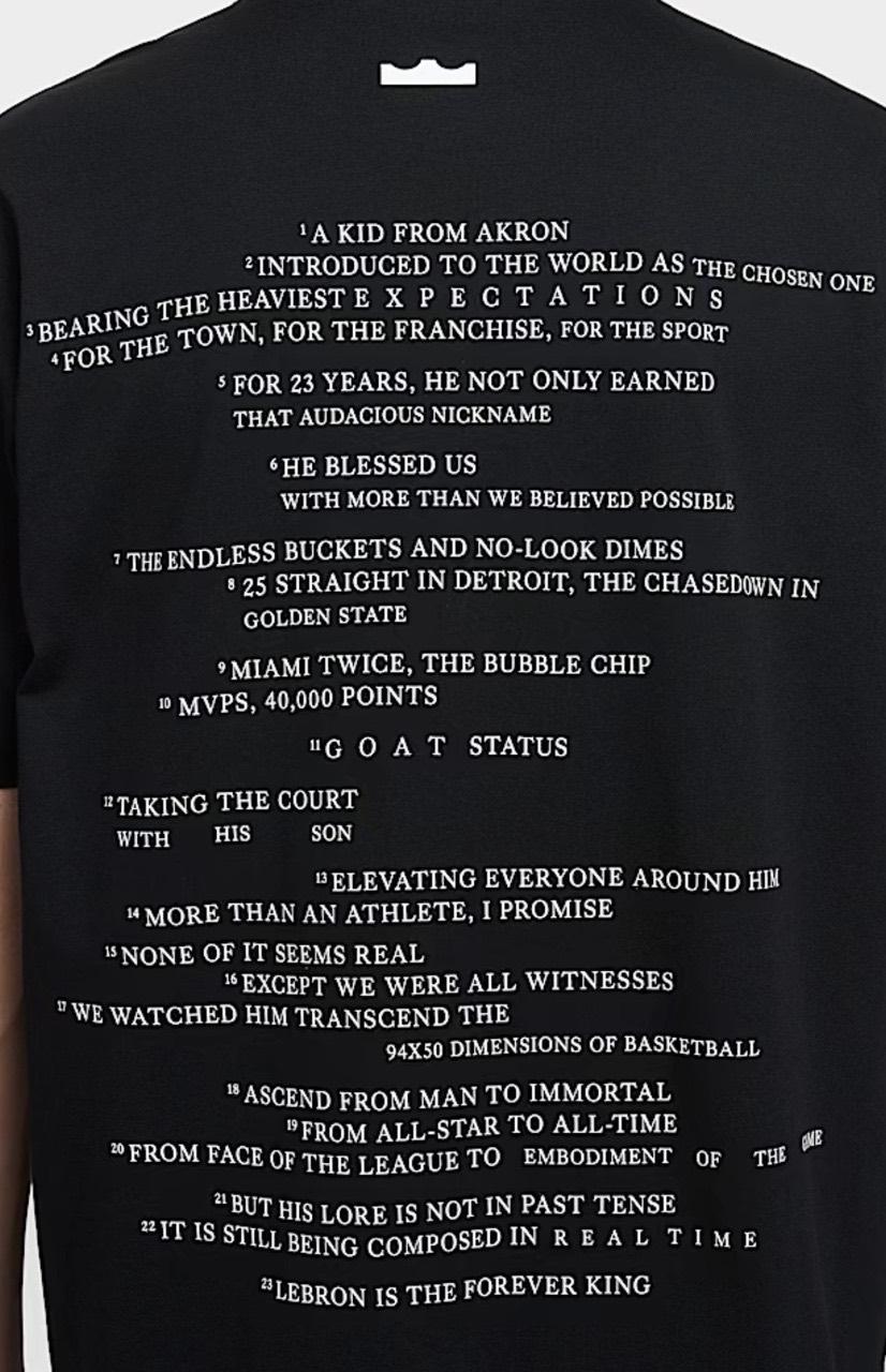 衣服的正面印有“Forever King”字样,而背面则是大有来头,描述了詹姆斯辉煌职业生涯的缩影。